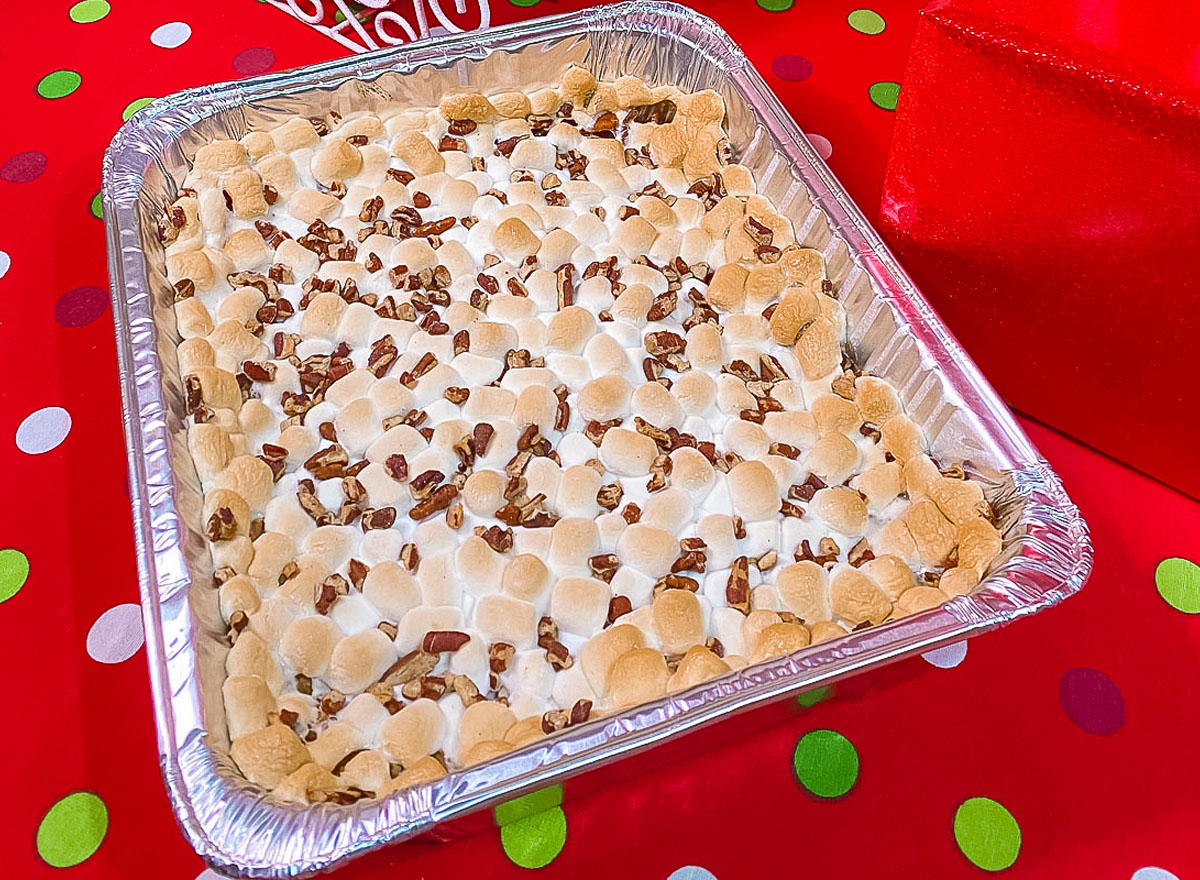 Cover the top in marshmallows and sprinkle some pecans on top of that